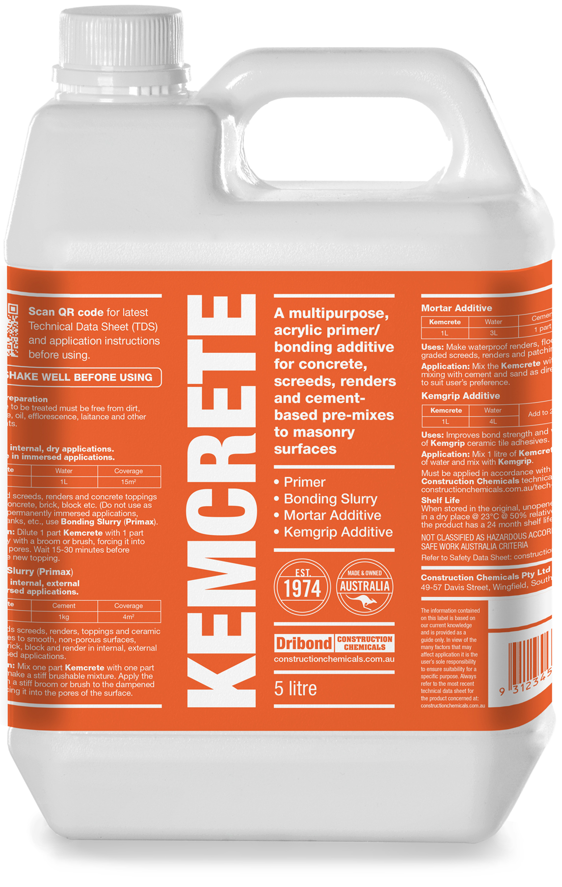 Mortar Additive: 1m²/litre (10mm thick in a 3:1 sand/cement mix)